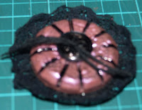 Last of all I used my copic black to mark the divisions again, added another, small black button to the centre and ran a length of embroidery silk through the button-holes a couple of times before adhering the lace round the back of the rim .